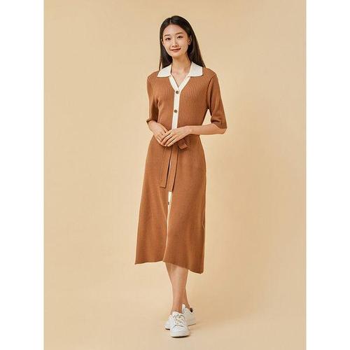 [옷자락]여자 오픈카라 배색 반팔 니트원피스 롱원피스