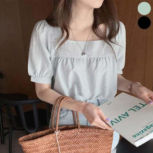 [셀럽하우스]셔링 AZMJ2903 크롭 반팔블라우스 스퀘어넥 블라우스 퍼프소매