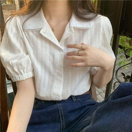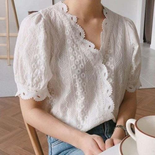 [신상오픈런]여성 레이스 퍼프 소매 대형 라운드 반팔 블라우스 (39101563)