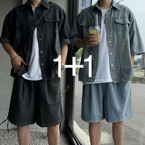 머시따 / 1+1 오버핏 워싱 데님 반팔 셔츠 자켓