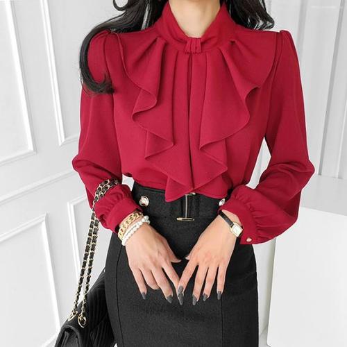 여자 여성스러운 하이넥 프릴 레이스 블라우스