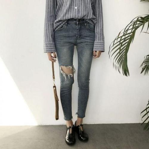 [옷자락]여자 블랙진 스키니 컷팅 구제 반하이 스판 청바지