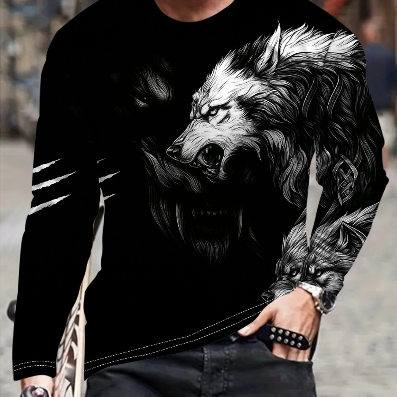 TEMU 남성용 3D 늑대 프린트 긴팔 티셔츠 - 블랙 캐주얼 크루 넥 티, 화이트 늑대 디자인, 사계절 편안한 핏, 캐주얼 의상에 완벽, 일상용 티셔츠 | 대담한 그래픽 티 | 편안한 핏, 그래픽 티셔츠 남성용, 긴팔 티셔츠 남성용, 남성용 티셔츠, 남성용 티셔츠, 남성용 티셔츠