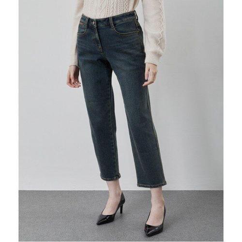 [미라클세븐]여성 세미 배기핏 뒷밴드 진청색 사선 절개 가을용 청바지