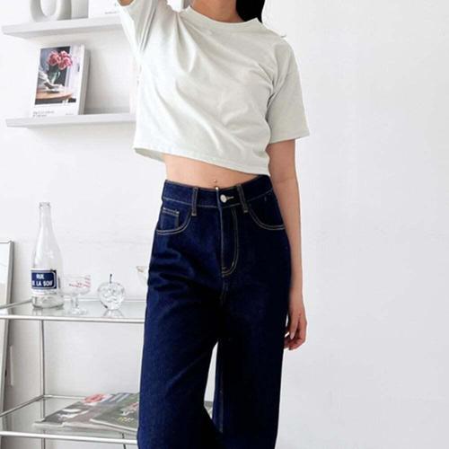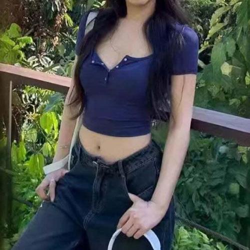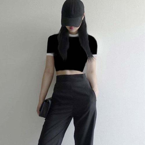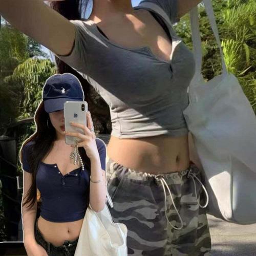 [셀럽하우스]여자 FMJC1976 슬림 스타일 크롭 배꼽티 슬람 라인 단추 반팔