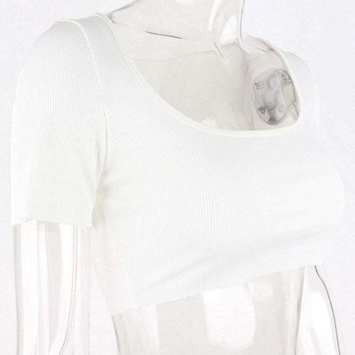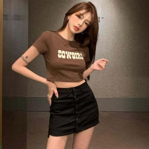 아메리칸 스타일 쿨 반팔 티셔츠 여성 여름 패션 퓨어 컬러 디자인 라운드 넥 리브드 크롭탑 배꼽 노출