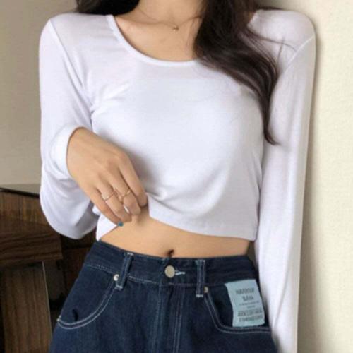 [셀럽하우스]여자 JVVE8722 피치밀키 긴팔크롭티 배꼽티 심플룩
