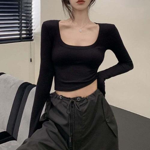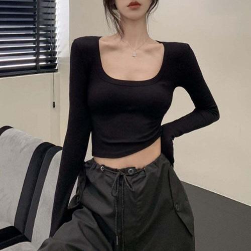 여성용 요가 티셔츠, 단색 스포츠 상의, 긴팔 체육관 운동 러닝 셔츠, 섹시한 노출 배꼽, 속건성 피트니스 체육관 스포츠웨어