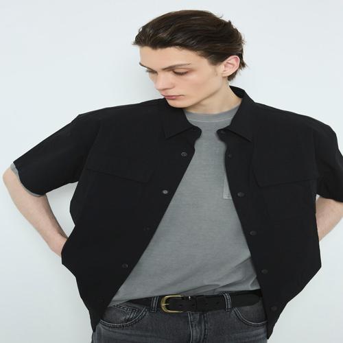 [버커루]루즈핏 가슴자수 우븐 반팔 셔츠