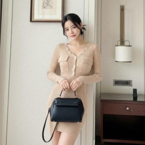 [옷자락] 여성 골지 버튼 디테일 포켓 캐주얼 미니 드레스