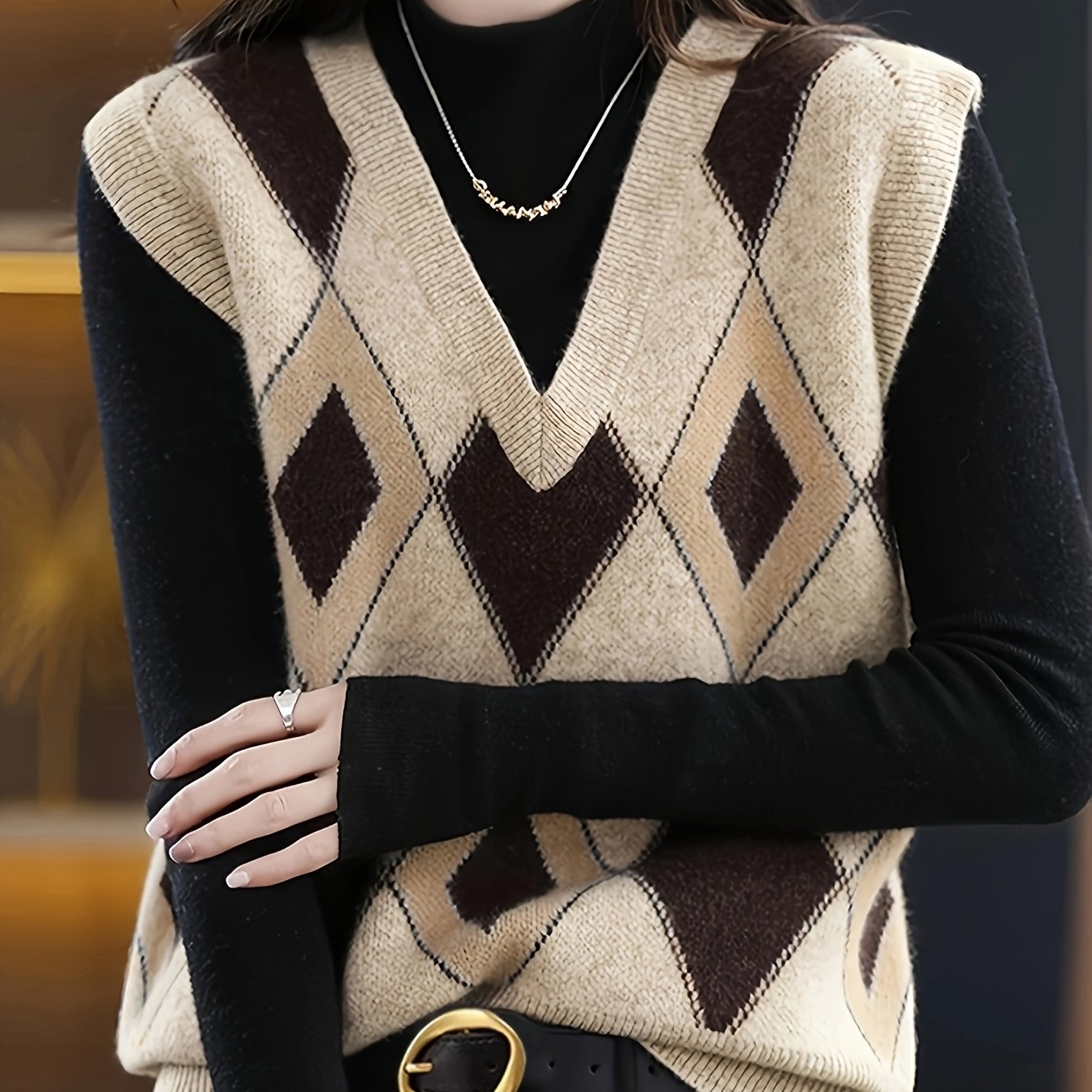TEMU 여성용 빈티지 V넥 컬러 블록 아길리 니트 베스트 스웨터 - 봄/가을용 캐주얼 슬리브리스 제리시 탑, 베이지 및 갈색/그레이 패턴, 편안한 핏, 가슴 패드 없음