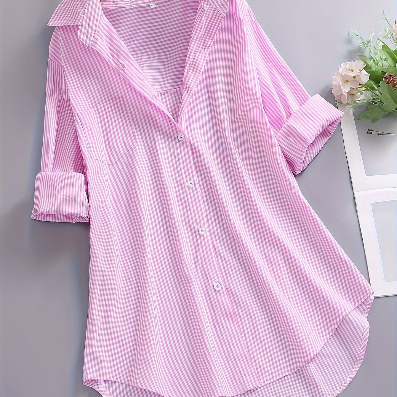 TEMU 플러스 사이즈 - 여성용 캐주얼 긴팔 셔츠, 루즈핏 포인티드 칼라 버튼업 탑, 수직 줄무늬, 가벼운 논스트레치 원단, 봄 여름 가을용, 캐주얼 & 포멀 웨어에 적합한 다목적 패션, 클래식 패턴, 비투명 소재