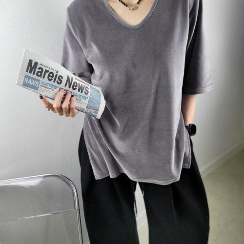 씨샵인더룸 / (블랙라벨) 부카 벨로아 어깨패드 트임 브이넥 5부 반팔 티셔츠 3color