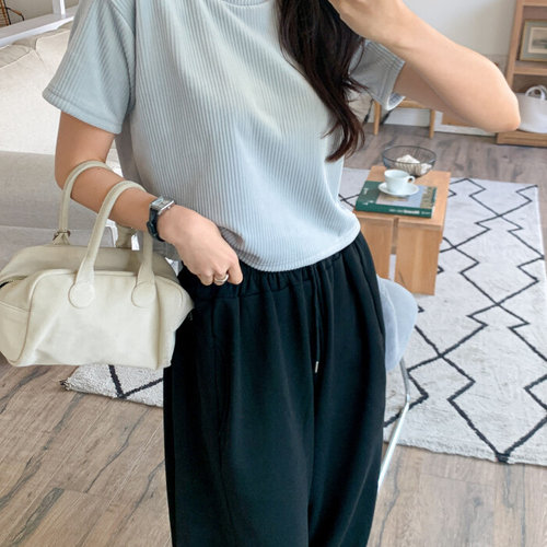 [미라클세븐]여성 겨울 크롭 반팔 벨로아 라운드넥 골지 티셔츠