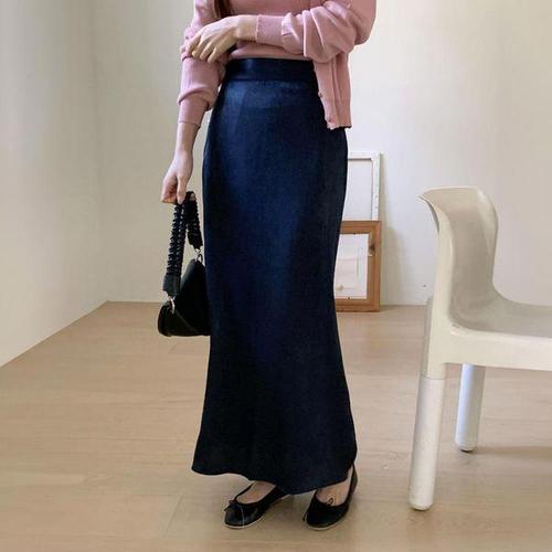 [신상오픈런]여자 키치무드 벨벳 포근 데님 h라인 롱 스커트 (43165151)