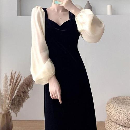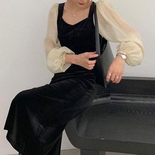 [엄지척]여자 캐주얼 시스루 소매와 벨벳 느낌의 원피스 치마_19869830_667501