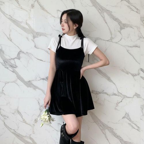 [미라클세븐]여성용 벨벳 셔링 스트랩 미니 드레스 가을 겨울 파티용