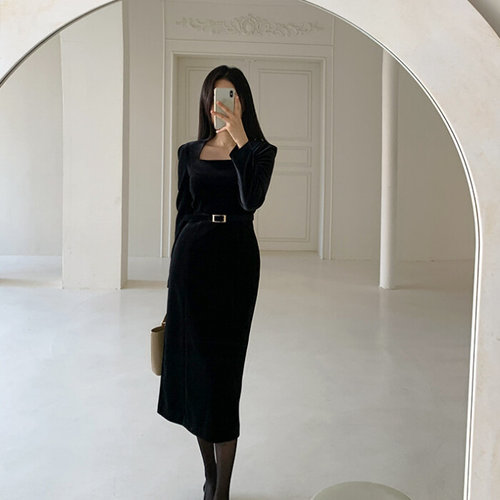 [비비드시크릿가너]여성 겨울 벨벳카라 머메이드 벨티드 원피스