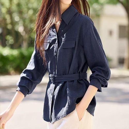 [옷자락]여성 클래식 브이넥 벨트포함 긴팔 셔츠