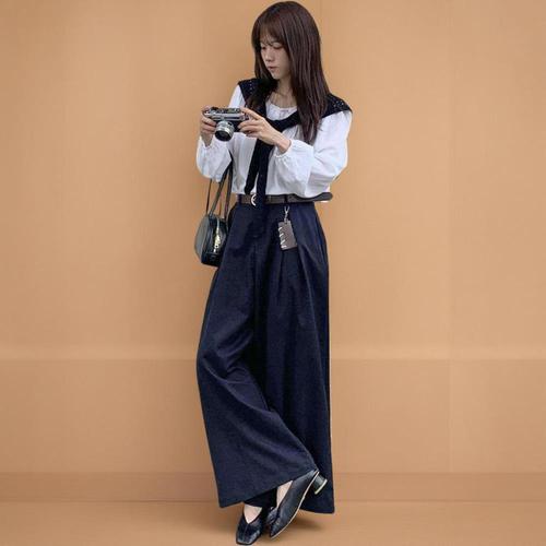 [옷자락] 여자 레이어드 벨트 미디 랩스커트 가을 와이드 슬랙스