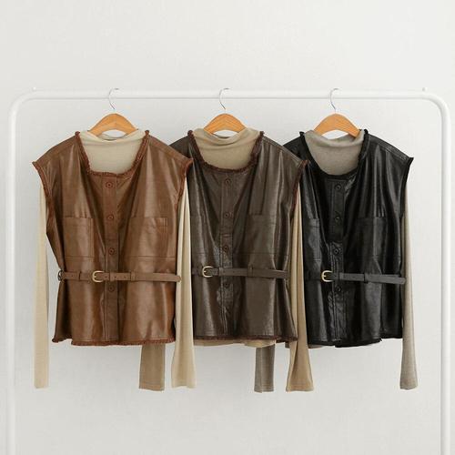 [다잇템][다잇템] 여자 프린지 단추 주머니 돌돌목폴라 가죽재킷 혁대 세트_23197653_588872