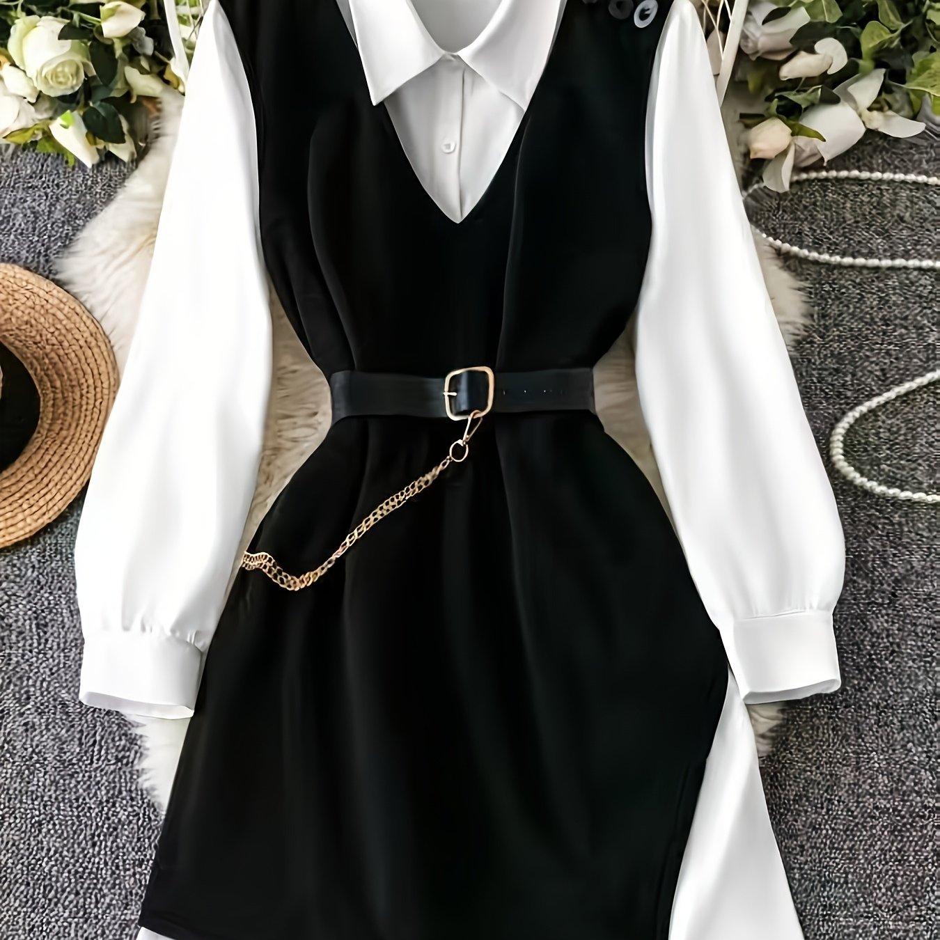 TEMU 플러스 사이즈 - 플러스 사이즈 캐주얼 화이트 셔츠 원피스, 조끼, 허리 주름 메탈 체인 장식이 있는 핏 좋은 투피스, 데이트 및 일상복으로 완벽합니다.