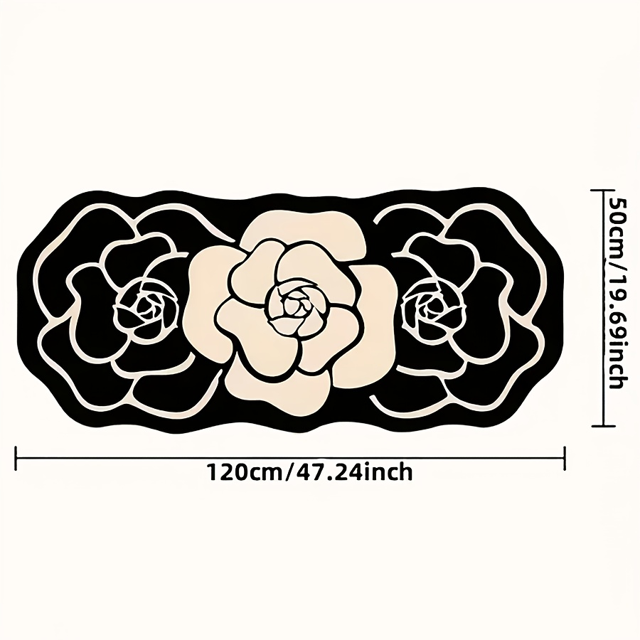 TEMU 1개 우아한 동백꽃 무리미끄럼 방수 매트 - 세탁기 사용 가능 소프트 플리스 폴리에스터, 블랙 & 크림 꽃무늬 디자인, 비정형 욕실/현관/샤워룸 장식용