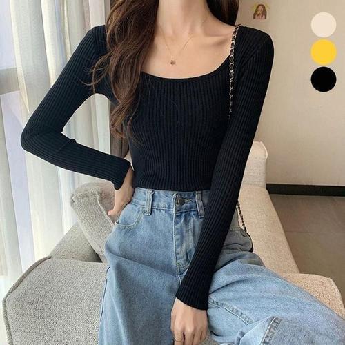 [라일리여성의류] Rly 여자 스퀘어넥 골지 긴팔 슬림핏 니트 날씬해보이
