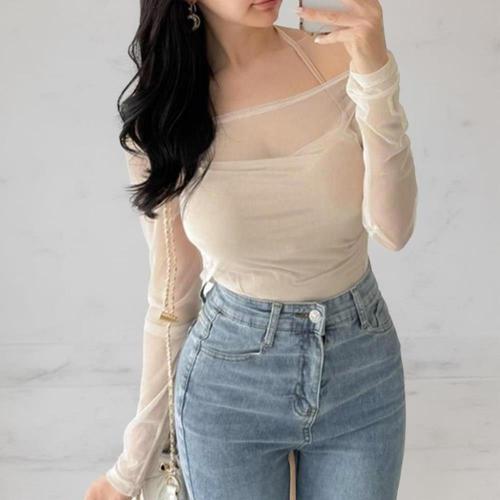 [옷자락]여성 시스루 오프숄더 홀터넥 레이어드 긴팔 티셔츠
