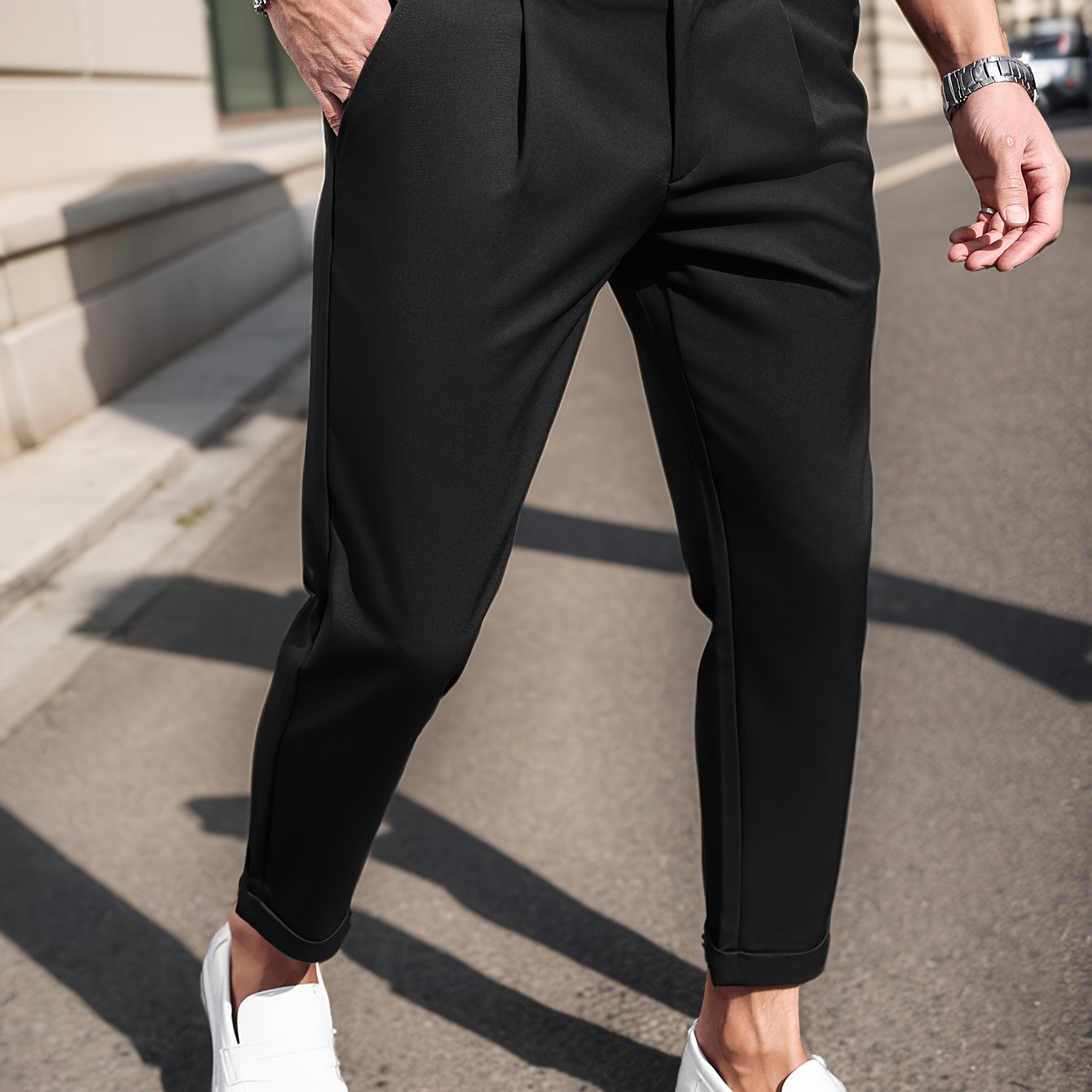 TEMU 남성용 슬림핏 캐주얼 드레스 팬츠 - 블랙, 스트레치 원단, 사계절 편안함, 직장 또는 정장 착용에 완벽, 매끄러운 질감, 내구성 있는 소재