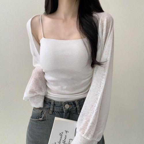 Izeriel 1+1 자외선차단 가디건 자켓 아우터 여름용 여성 쉬폰 숏 자켓 세련된 얇은 긴팔 가디건 시원하고 가벼운 에어컨 아우터 데일리룩 카디건