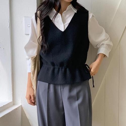 [신상오픈런]|CHD238C|허리조절 니트 여성 브이넥조끼 무지남방 봄세트 상의_19885519_597559