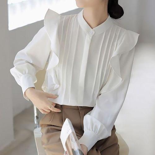 [에이치플러스몰]여성 봄 러플 블라우스 주름 핀턱 셔링 스탠드카라
