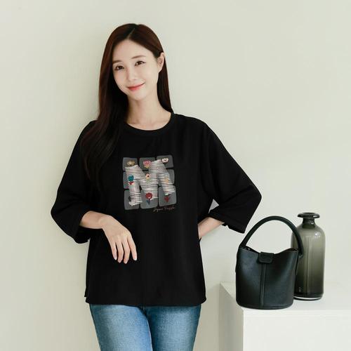 [샵앤]로코 여성 라운드 봄 여름 루즈핏 패턴 반팔 블라우스 CHO-WBL-11874-아이보리