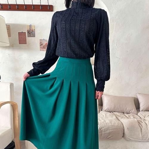 [신상오픈런]여성 물결 레이스 펀칭 폴라넥 퍼프 블라우스 봄 하객 패션