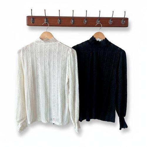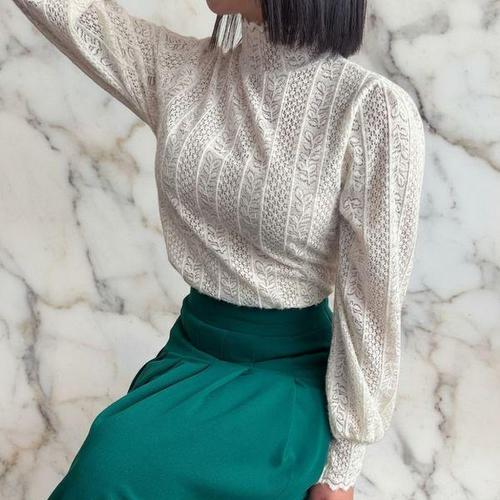 [신상오픈런]여성 펀칭 레이스 물결 디자인 폴라넥 퍼프 블라우스 봄 하객 패션
