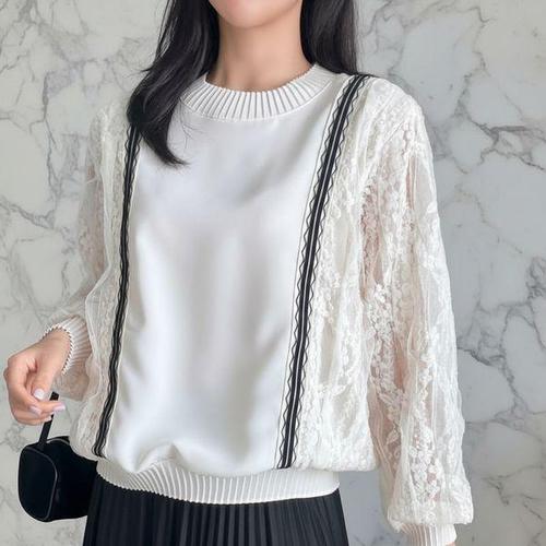 [신상오픈런]여성 꽃무늬 시스루 레이스 퍼프넥 플리츠 봄 블라우스
