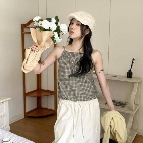 밑단 데님 쉬폰 뷔스티에 체크 끈 며훈다 온나 WFKNXPG