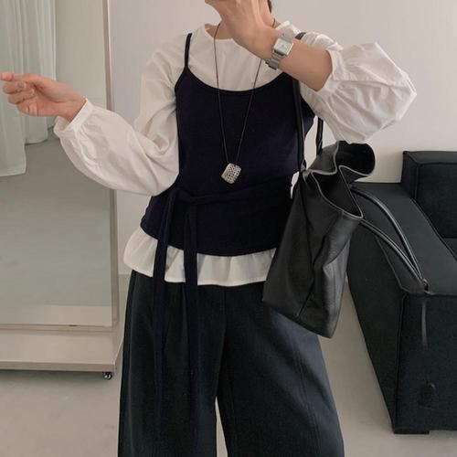 [신상오픈런]여성 라운드넥 긴팔 블라우스와 뷔스티에 세트