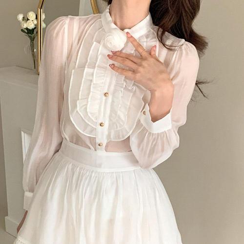 [기타브랜드]여자 러플 카라 블라우스 진주 버튼 포인트의 로맨틱