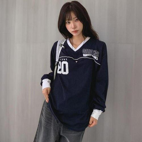 SAHINER 봄가을 여성 브이넥 루즈핏 맨투맨 긴팔 데일 티셔츠 LWAWY46
