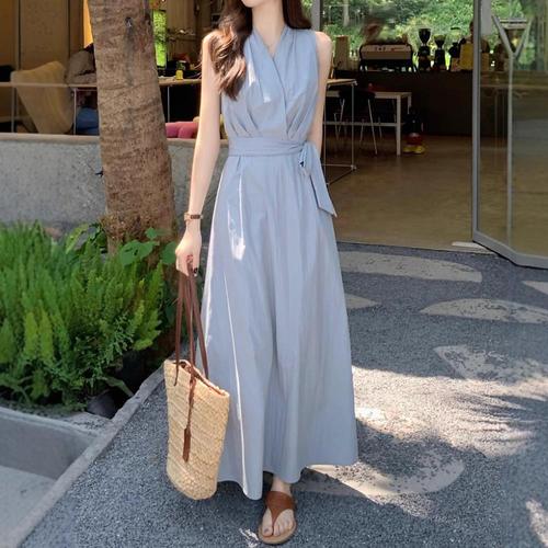 [옷자락]여자 V넥 랩스타일 허리 스트랩 민소매 롱 원피스