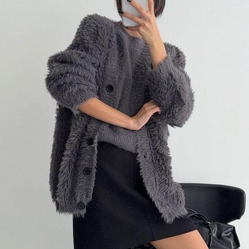 [신상오픈런]여성 브이넥 루즈핏 퍼가디건과 털나시 세트 겨울용