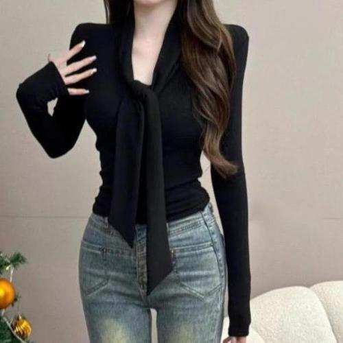 [셀러허브_여성트랜드패션]여성 리본 슬림핏 환절기 롱슬리브 V넥 셔츠