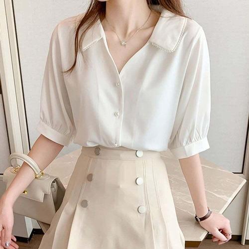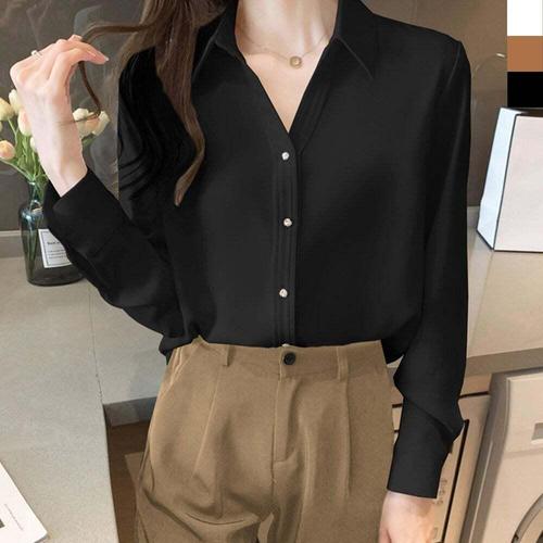 [셀럽하우스]진주 SIZX0703 카라 브이네크라인 새틴 쉬폰 블라우스