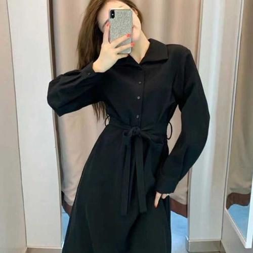 [셀러허브_여성트랜드패션]ONM 여자 하객 룩 결혼식 셔츠 카라 롱 블랙 원피스 코디