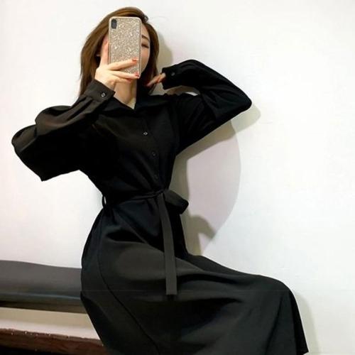 [엄지척]여성 허리끈 코트형 롱원피스 카라 긴팔원피스 올블랙_19911203_667501