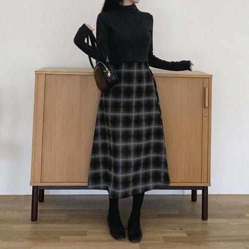 [옷자락]여자 도톰 하이웨스트 배색 체크 a라인 롱 스커트