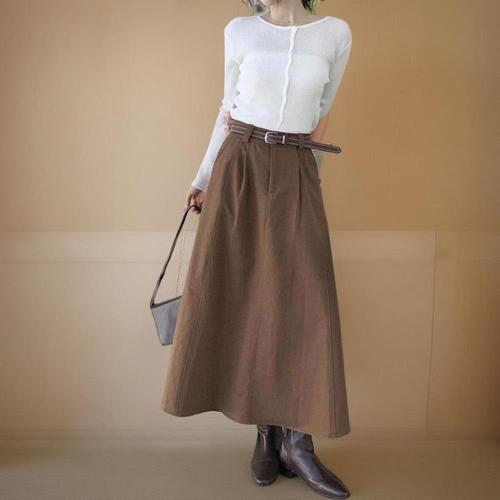 [미라클세븐]여성 레이온 핀턱 하이웨스트 벨트 롱 A라인 스커트