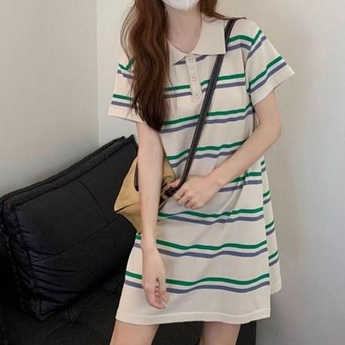 [옷자락] 여성 비스코스 배색 스트라이프 카라 반팔 미니 원피스